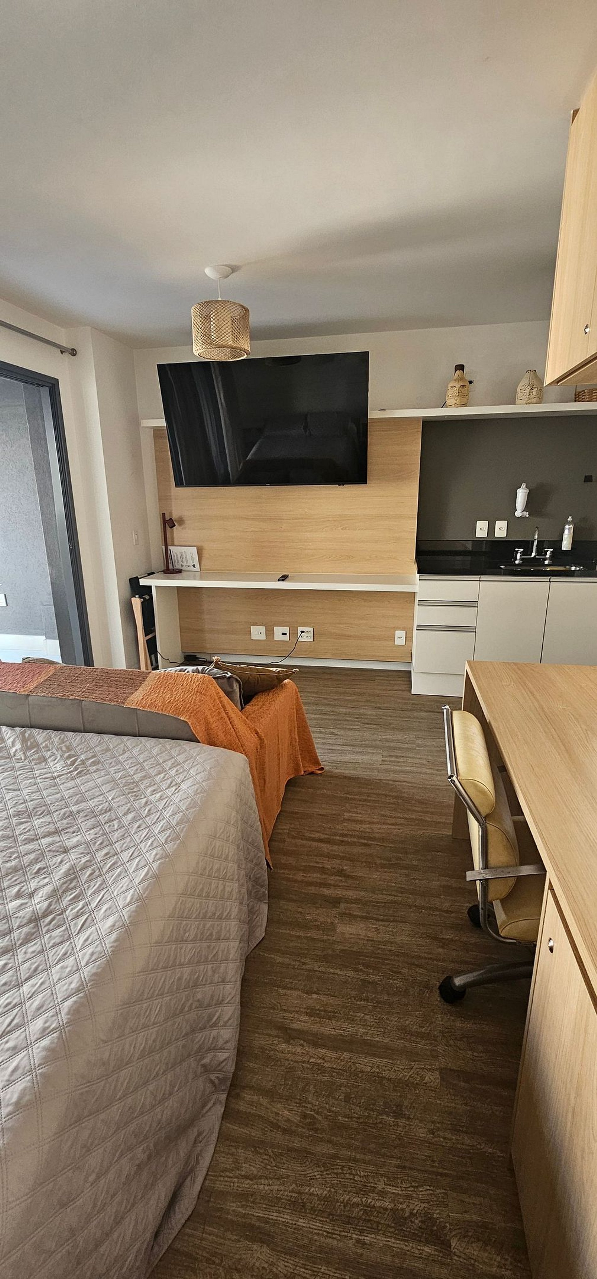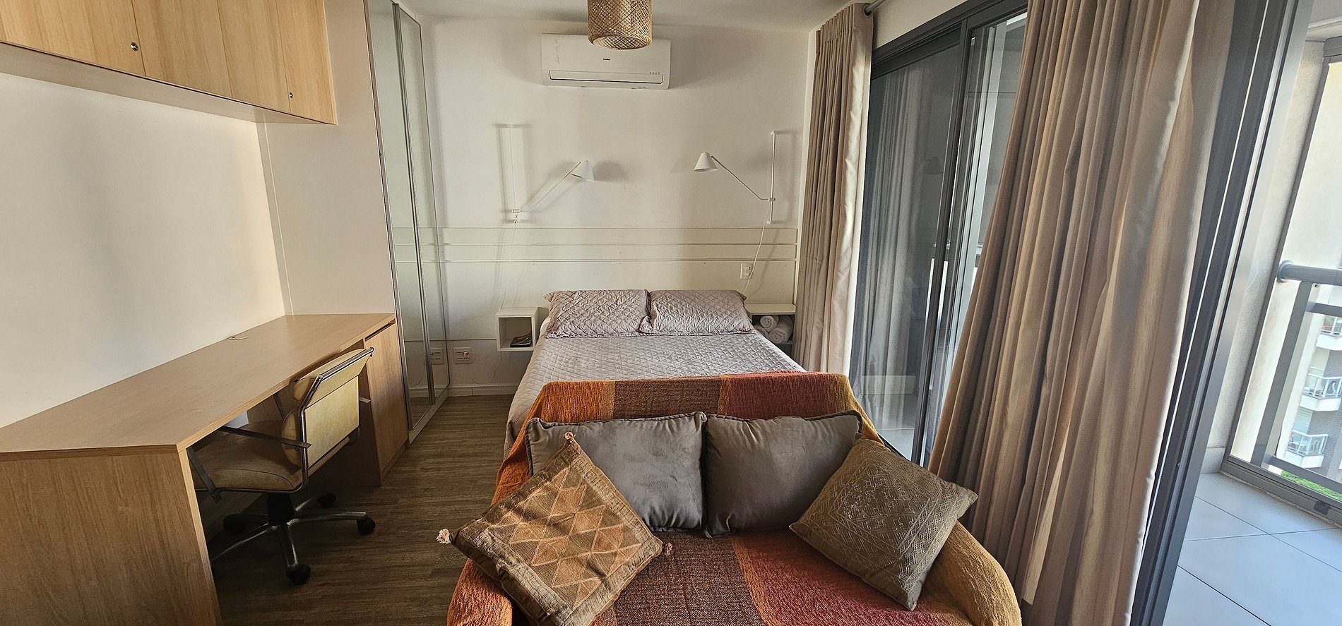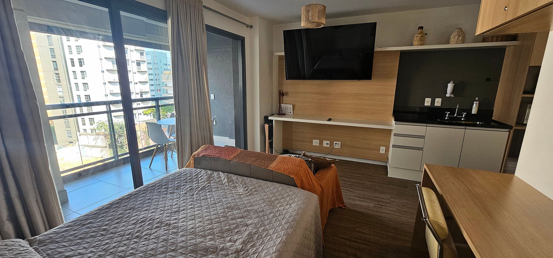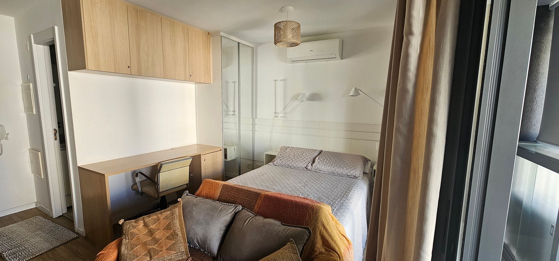 O studio possui 46m2 e conta com uma cama queen size, kitchenette, banheiro privativo, varanda e uma área de lazer completa na área comum do condomínio.