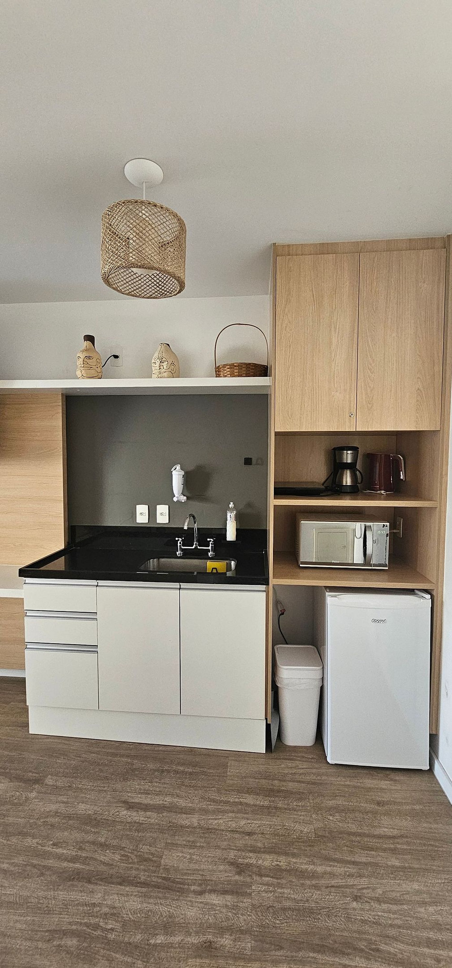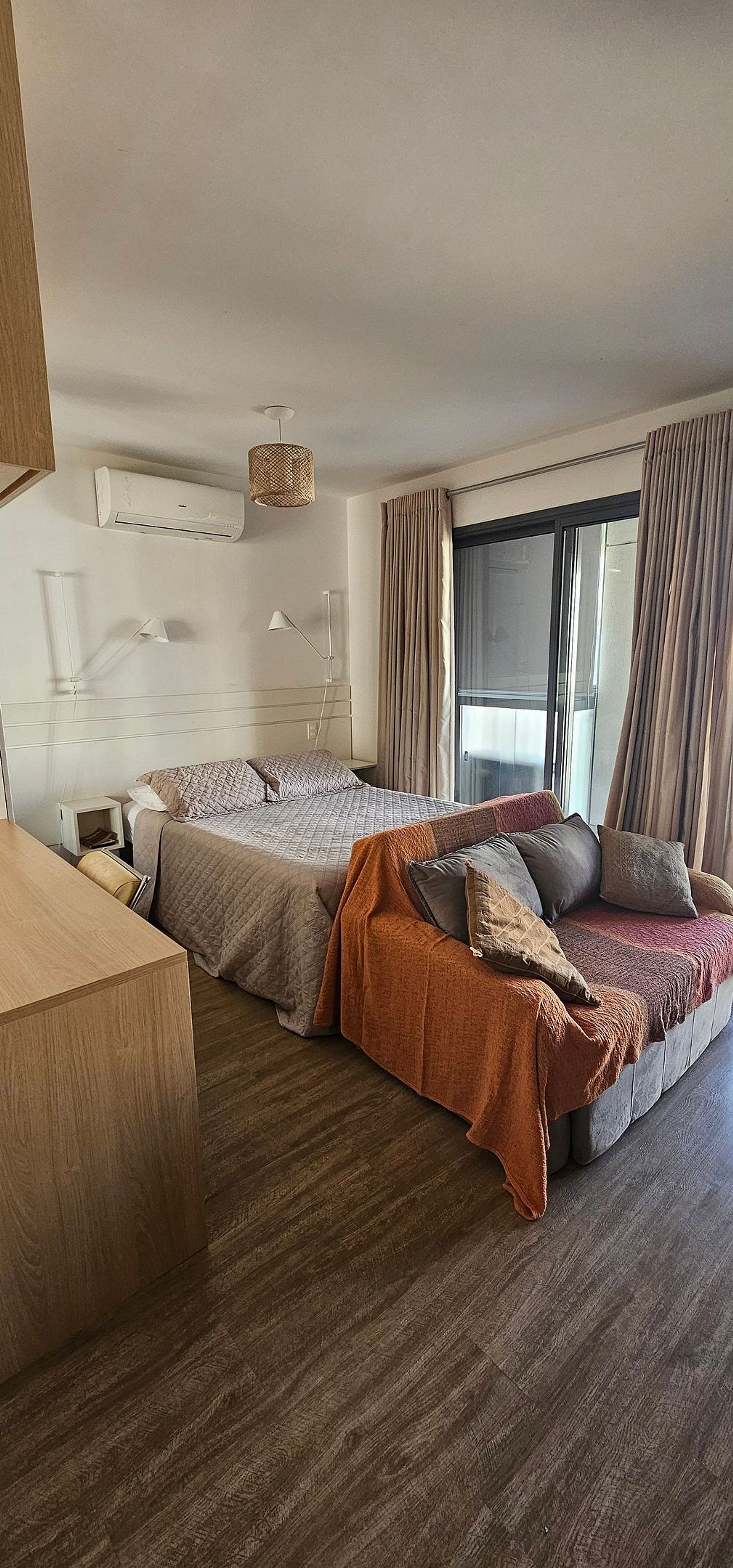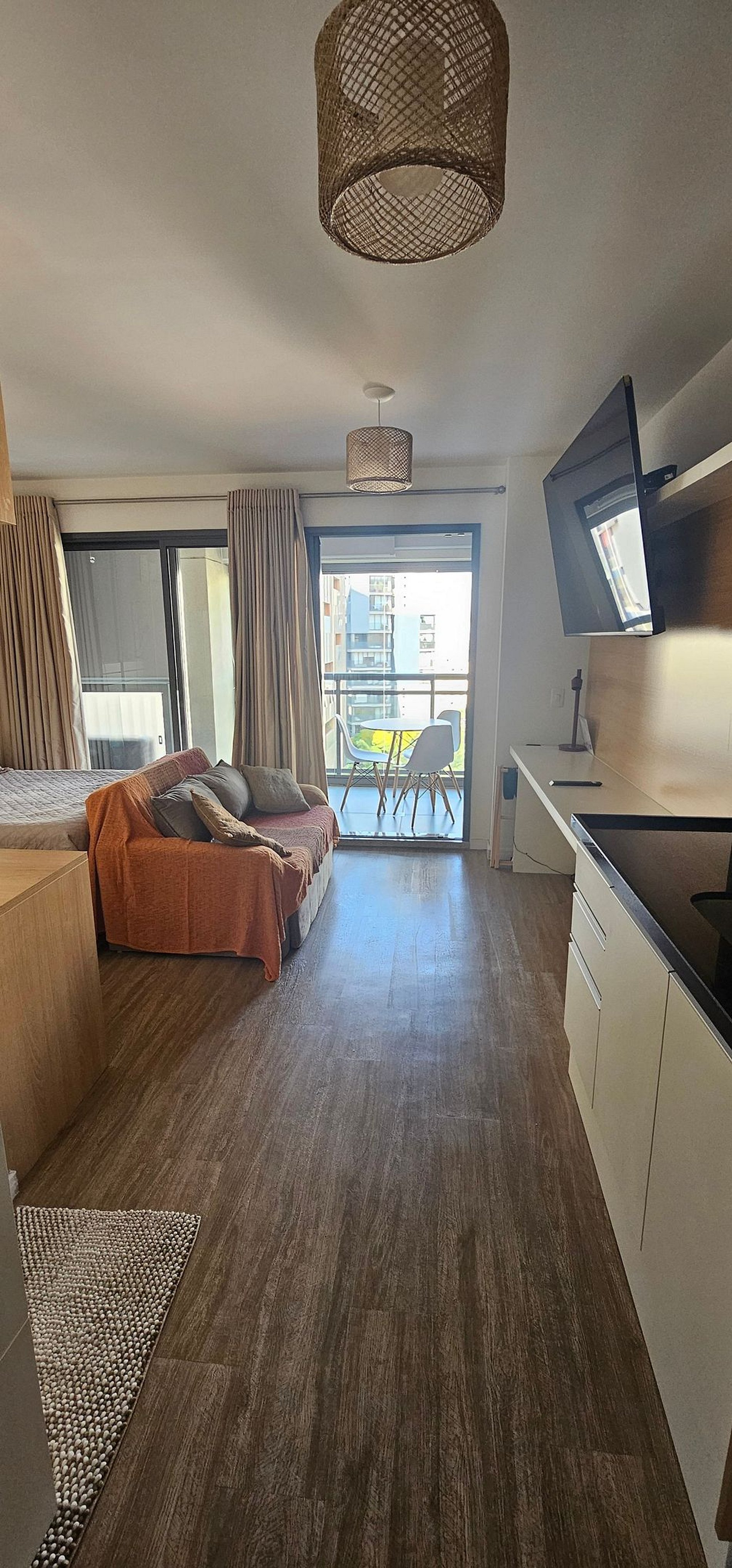 O studio possui 46m2 e conta com uma cama queen size, kitchenette, banheiro privativo, varanda e uma área de lazer completa na área comum do condomínio.