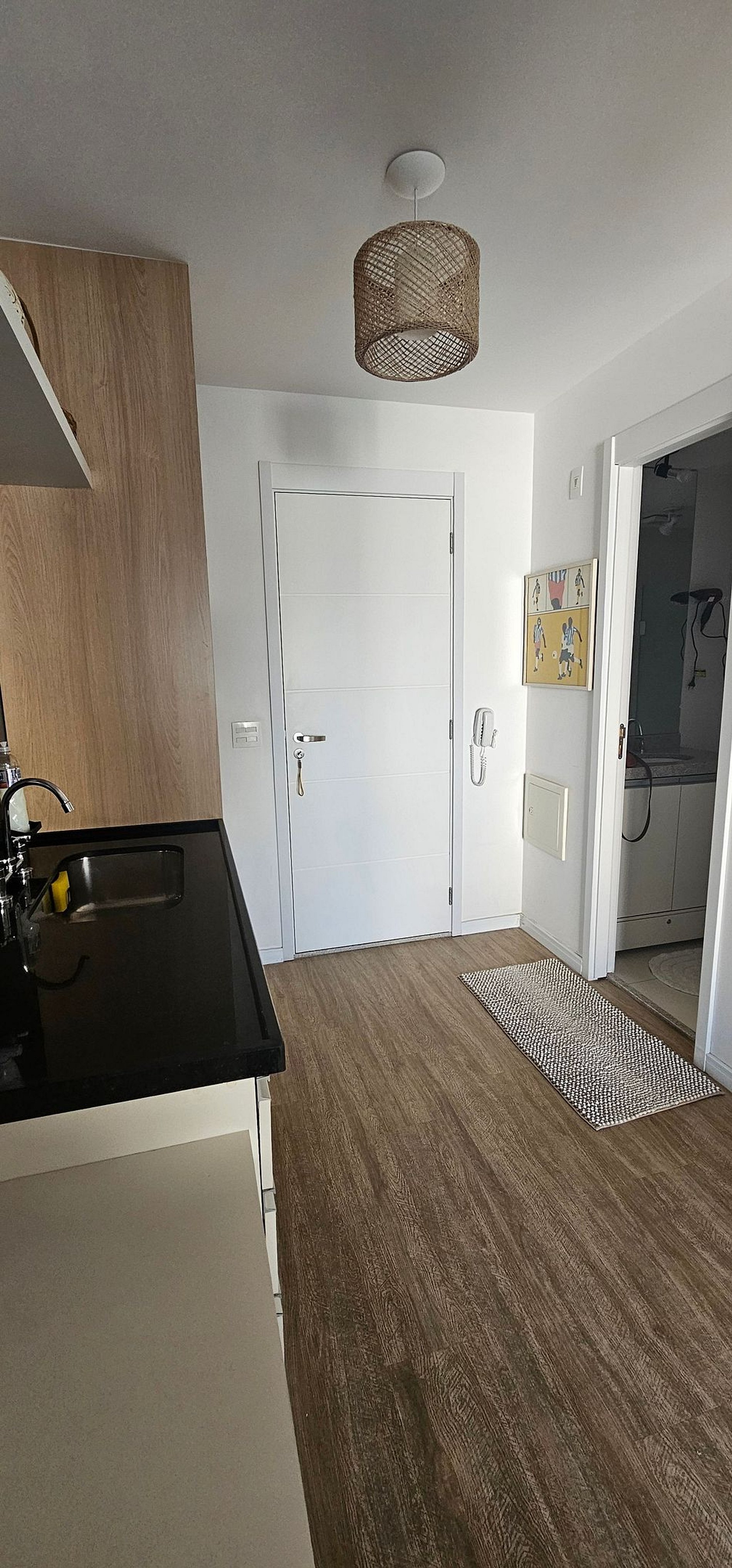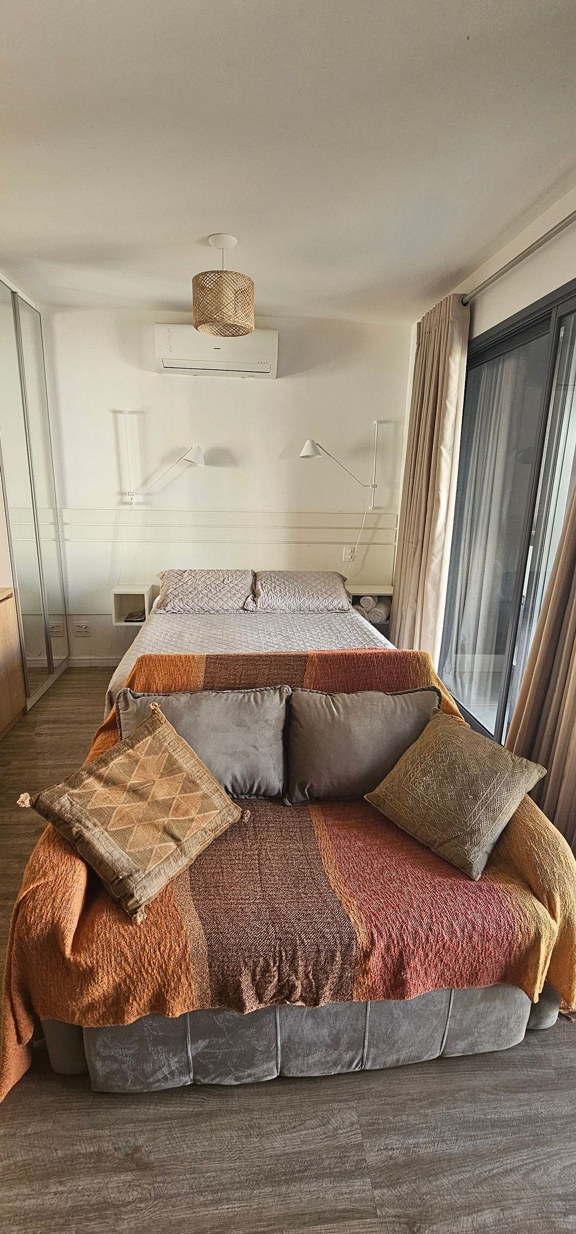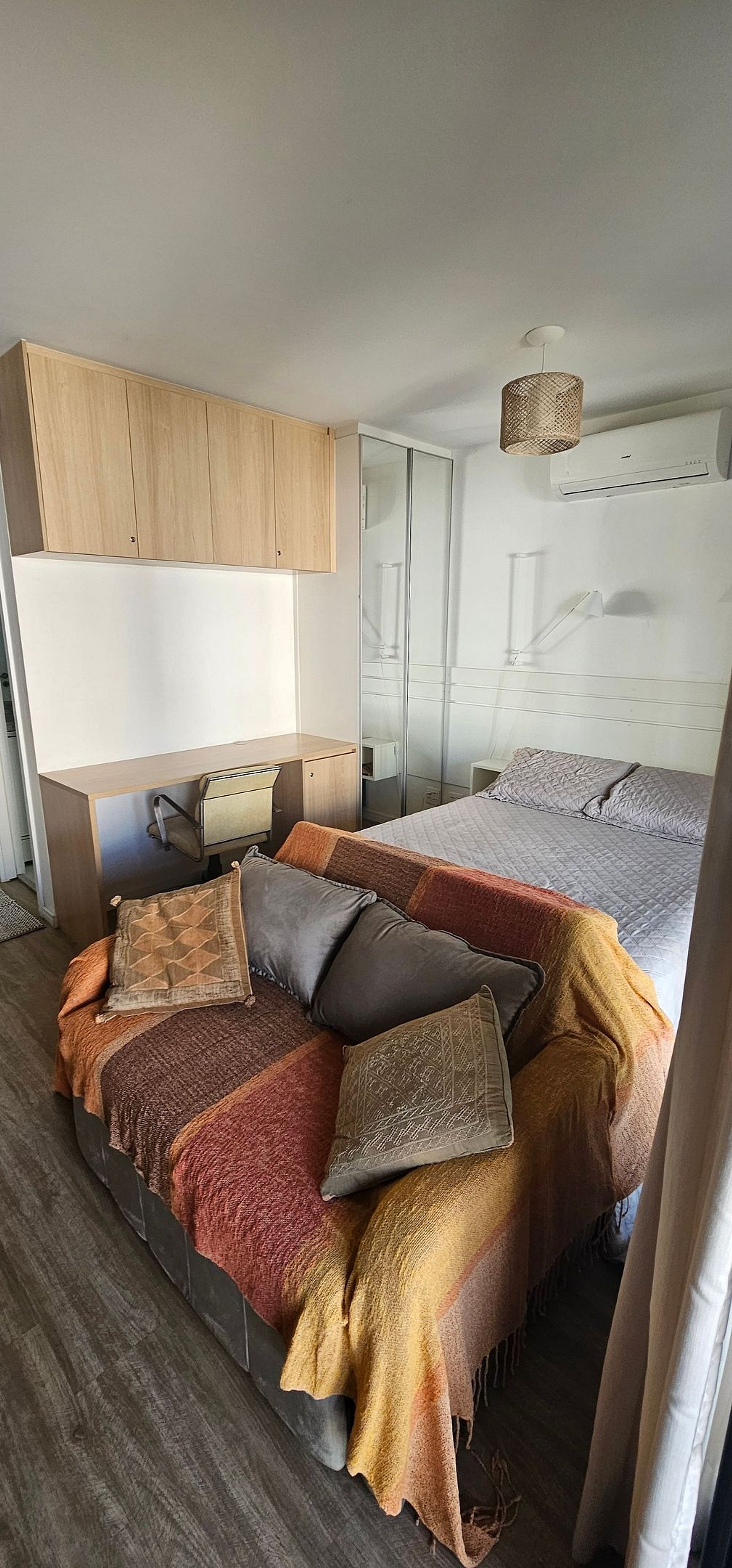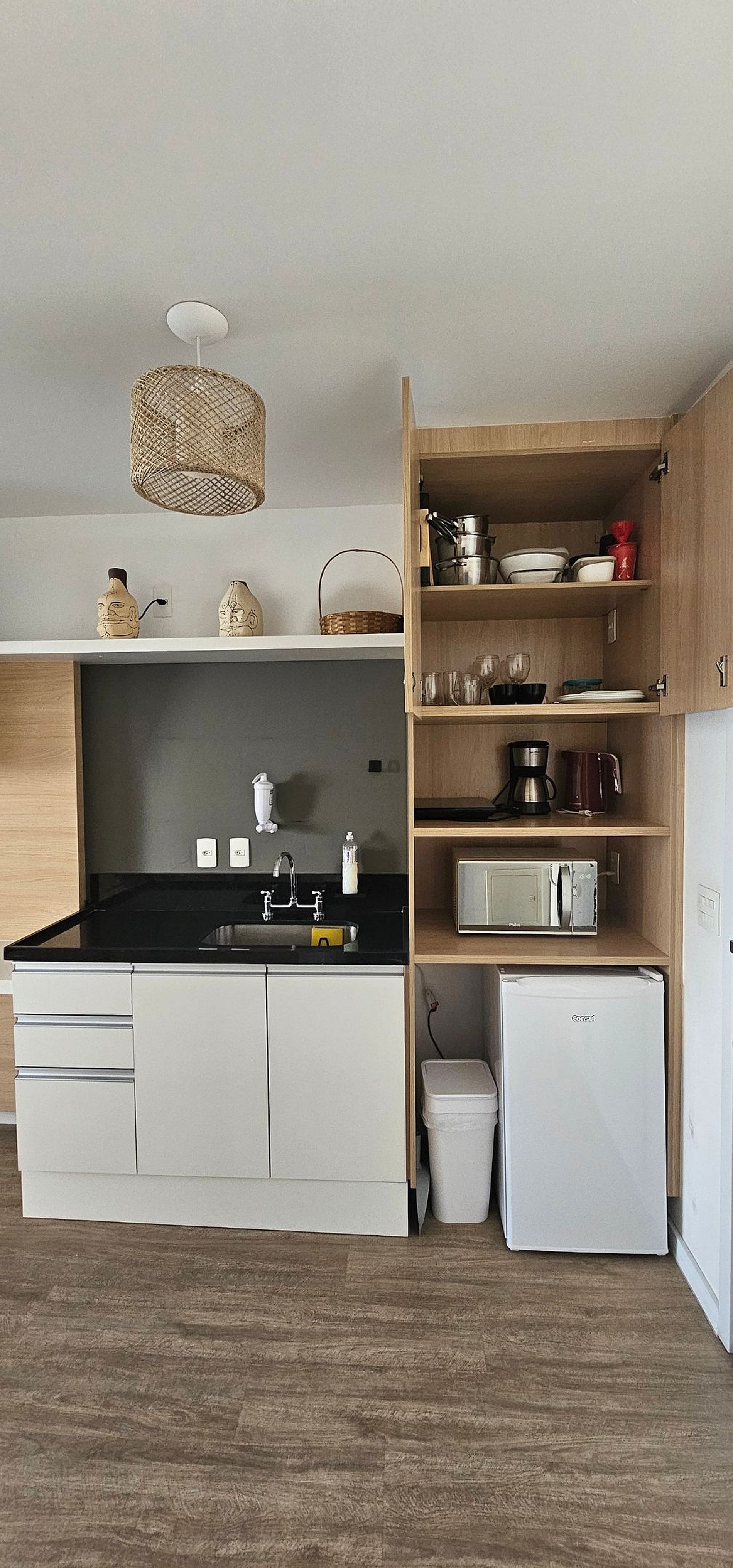 O studio possui 46m2 e conta com uma cama queen size, kitchenette, banheiro privativo, varanda e uma área de lazer completa na área comum do condomínio.