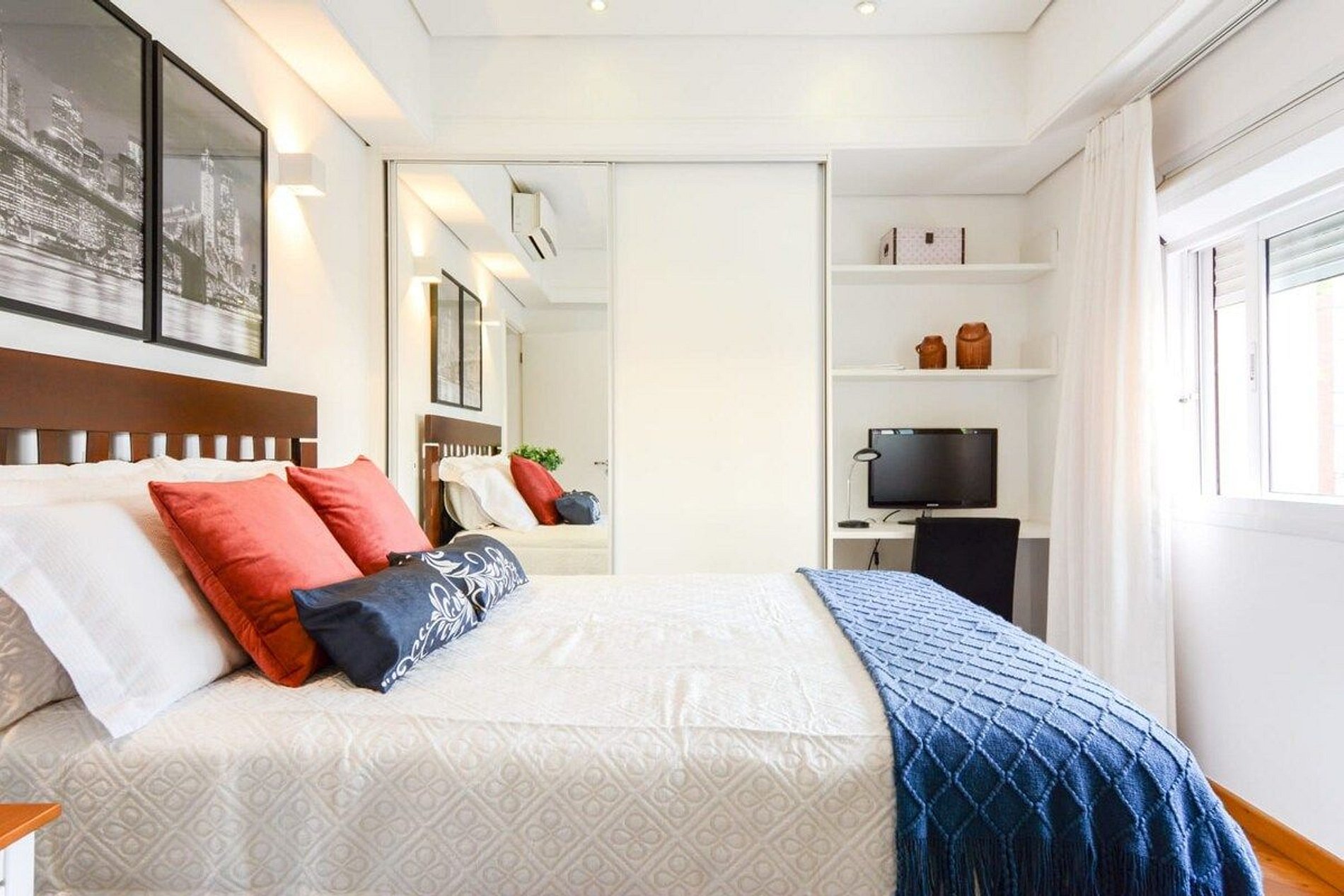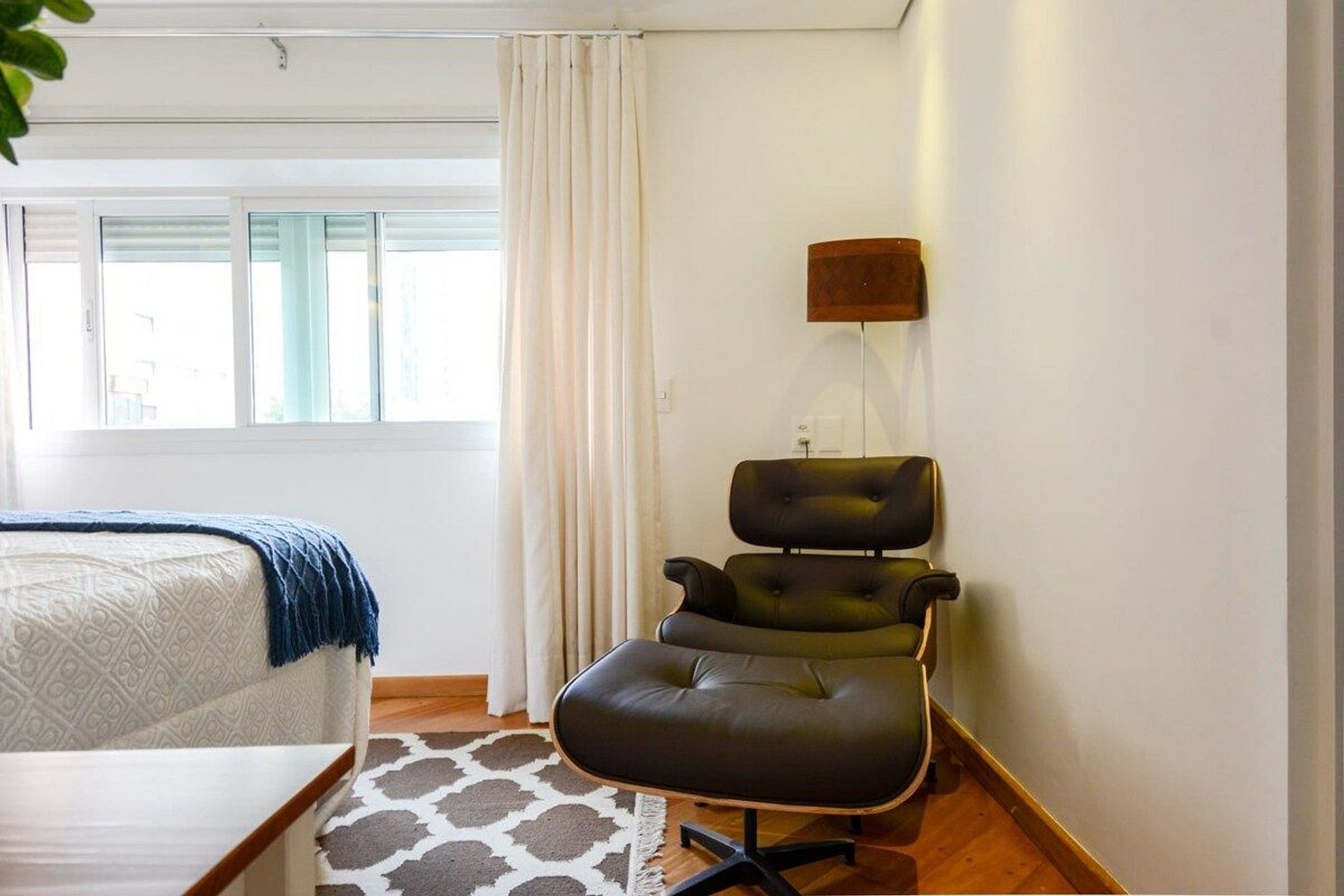 Apartamento a 100 metros da Av. Paulista, em condomínio com piscina, academia e excelente localização. O apartamento possui ar condicionado na sala e no quarto, cama de casal e decoração elegante.