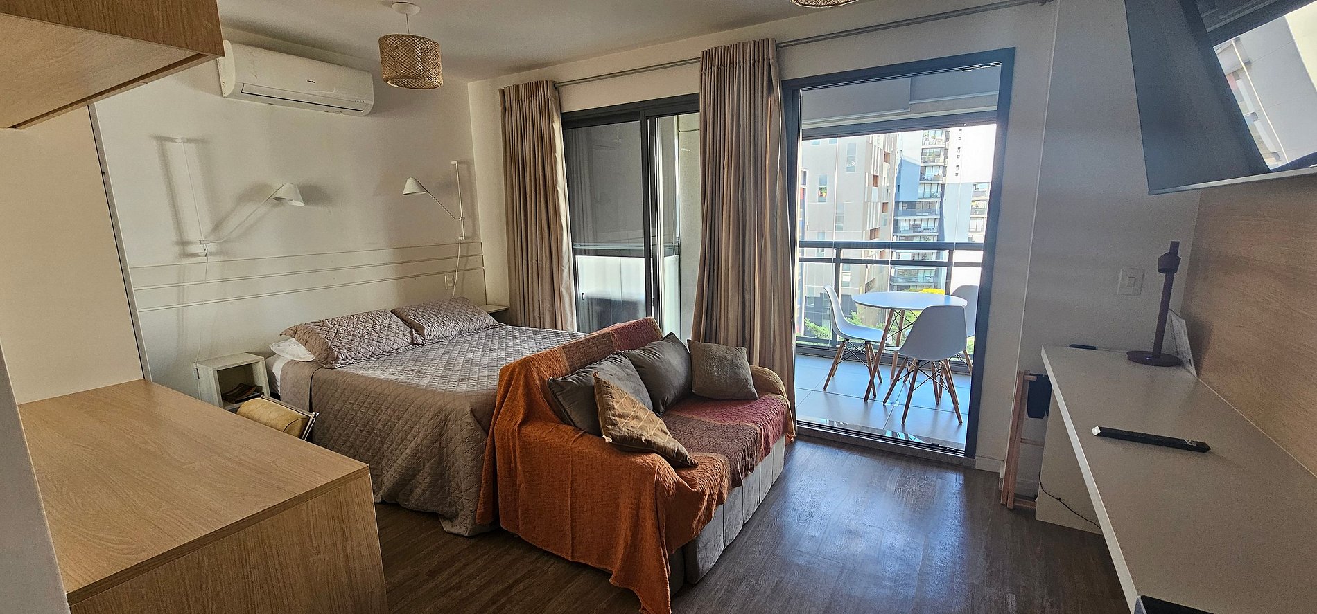 Este aconchegante estúdio de 36m² foi cuidadosamente planejado para oferecer o máximo de conforto e praticidade. O ambiente conta com uma confortável cama queen size, um sofá-cama de casal, e uma varanda envidraçada, proporcionando um espaço tranquilo e iluminado. A cozinha compacta está equipada com cooktop, frigobar, micro-ondas, cafeteira e chaleira elétrica, ideal para suas necessidades gastronômicas.