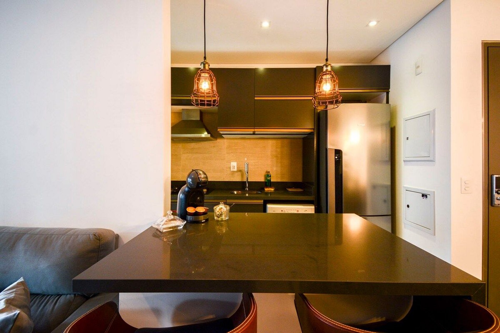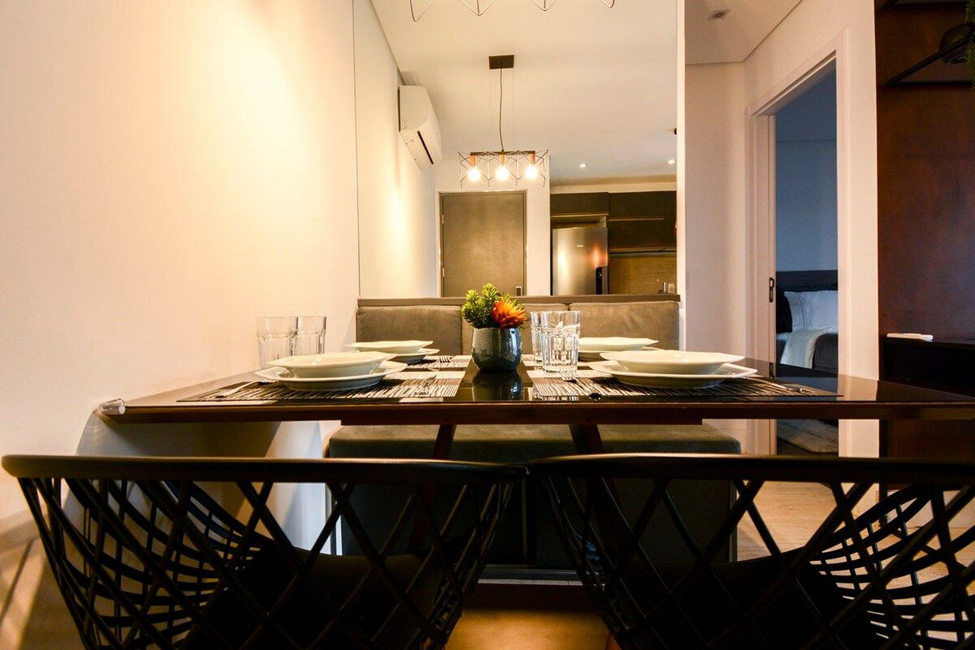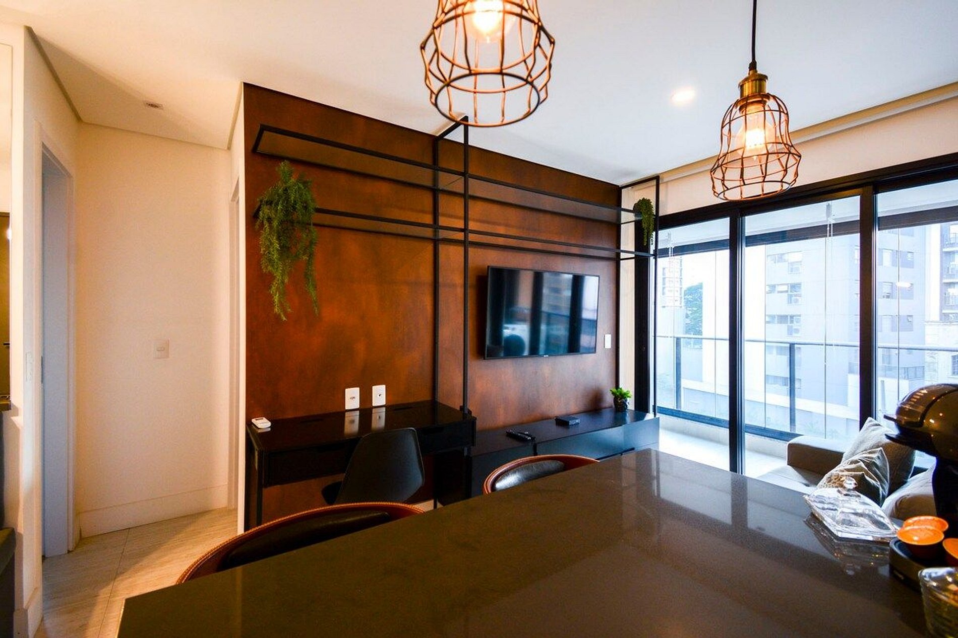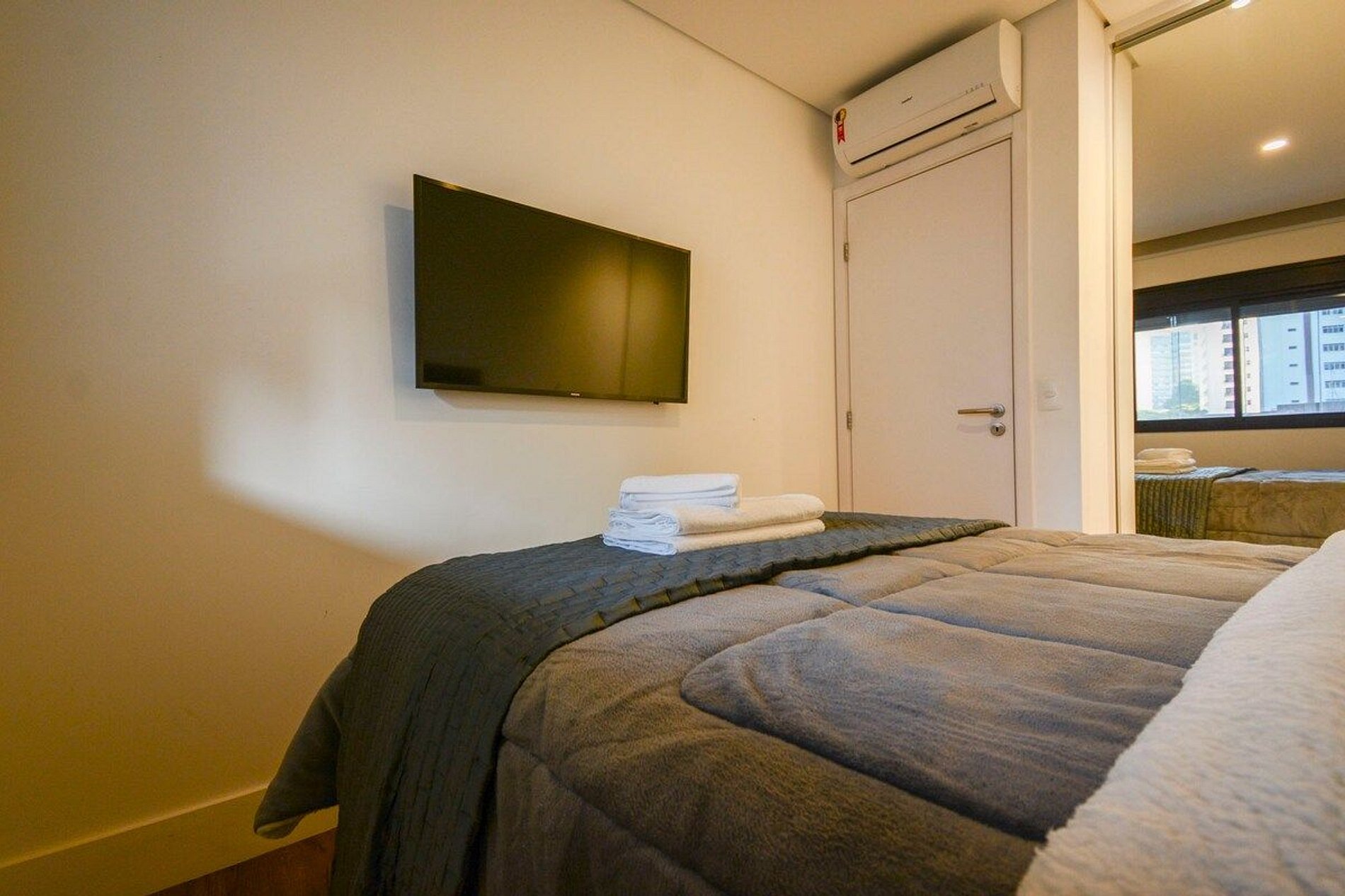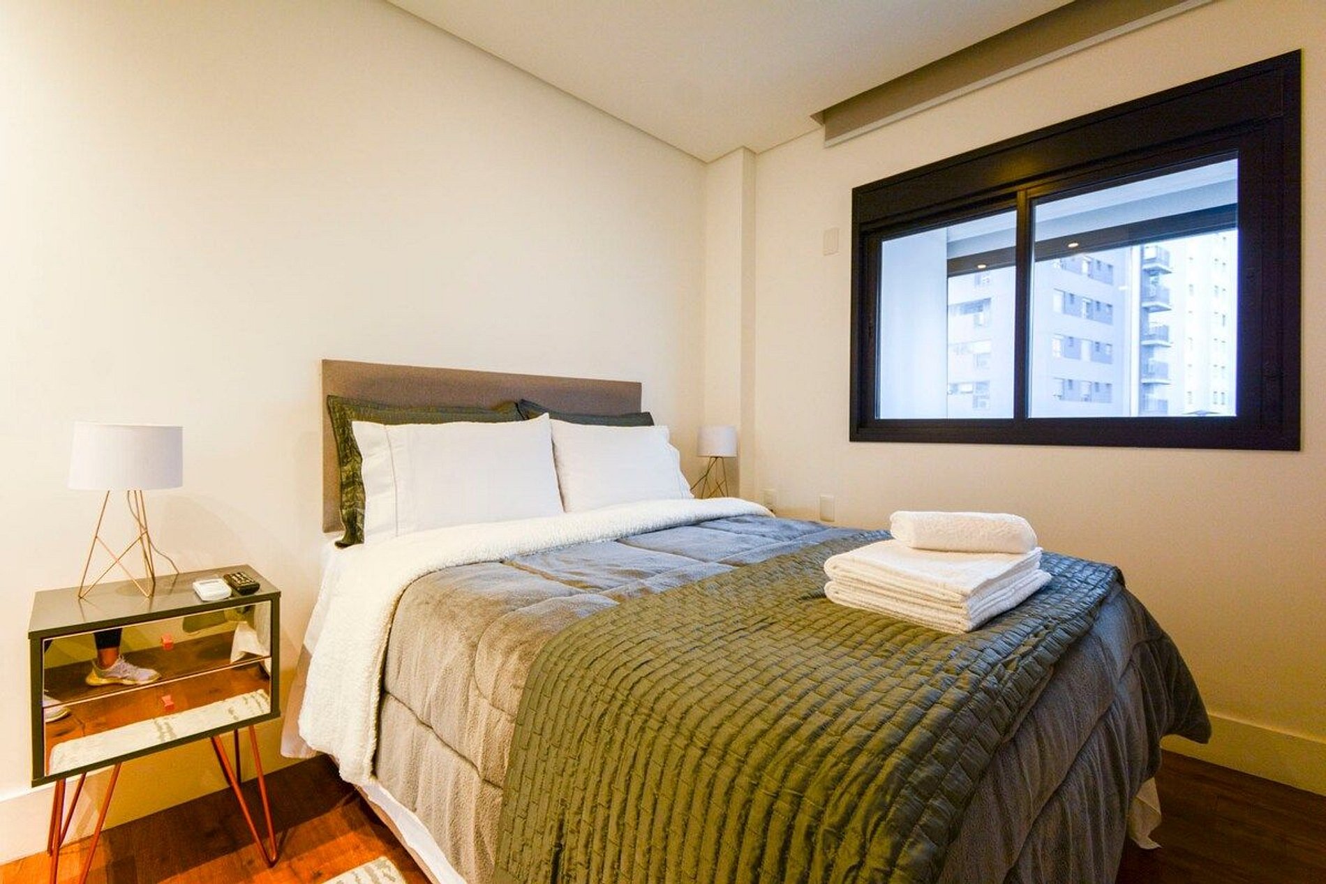 Apartamento decorado em condomínio de alto padrão, situado no coração da cidade, próximo ao hospital São Luiz do Itaim e a clínica OncoStar. Possui uma vaga de estacionamento, Wi-Fi e TV a cabo. Todas as áreas comuns do condomínio como piscina e academia podem ser utilizadas mediante agendamento.